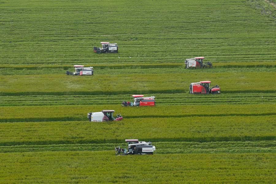 浙江省余姚市浜海現代農業産業先導區で晩稲を収穫するコンバイン。(9月23日、ドローンから、余姚=新華社配信/張輝)