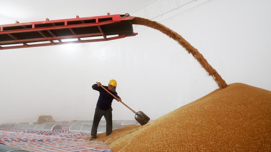 江蘇省連雲港市の江蘇省新海食糧備蓄直屬庫で、貯蔵施設へ運ばれる検収済みの小麥。(6月9日撮影、連雲港=新華社配信/耿玉和)
