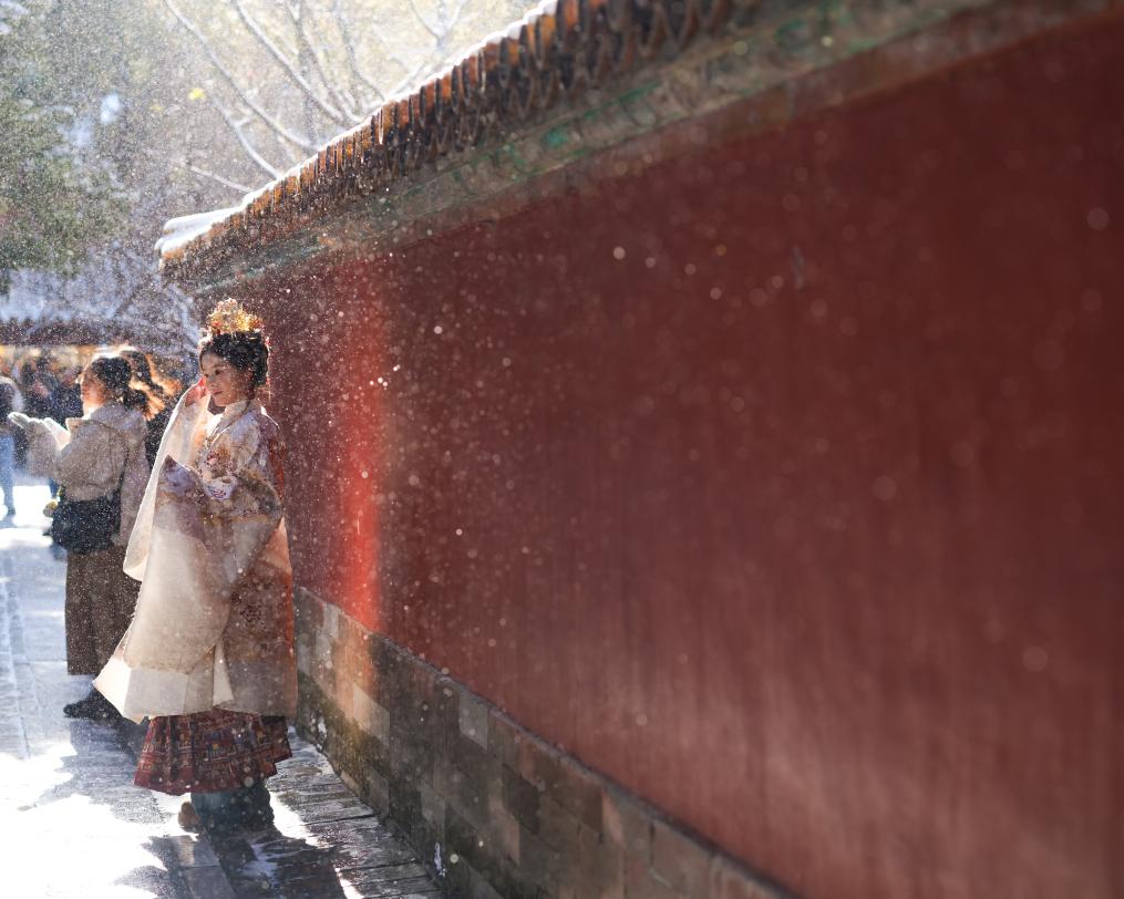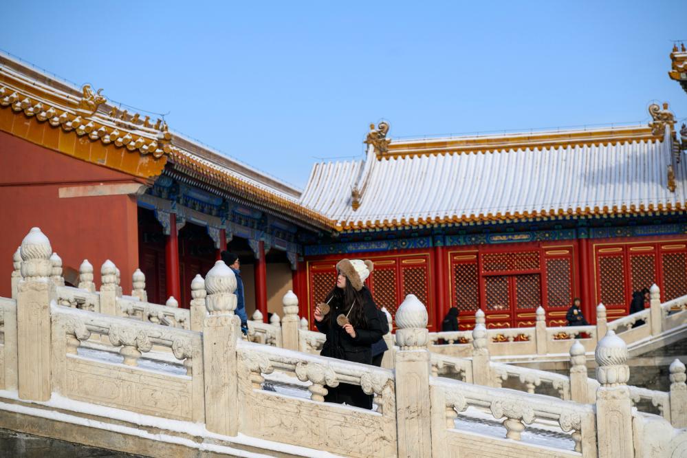 13日、雪がやんだ後、故宮を散策する観光客。(北京=新華社記者/馬暁冬)