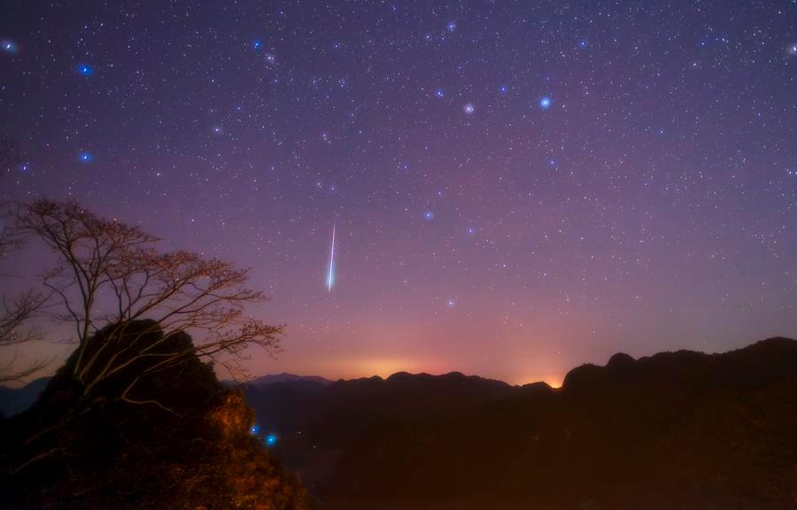 【新華社賀州12月20日】中國広西チワン族自治區賀州市の岔山村でこのほど、寫真愛好家がカルスト地形の山間に見えるふたご座流星群を撮影した。