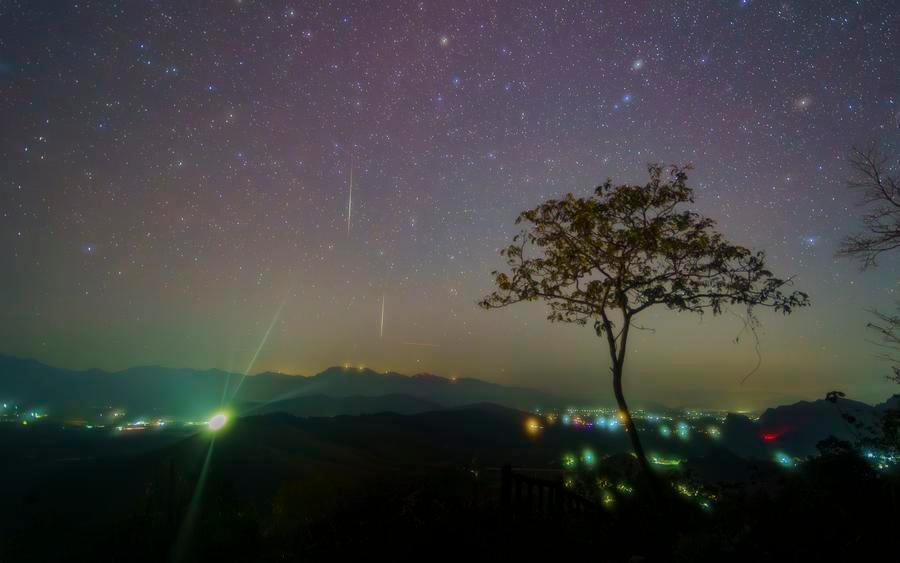 14日、広西チワン族自治區賀州市の岔山村で寫真愛好家が撮影したふたご座流星群。(賀州=新華社配信/黎鴻飛)
