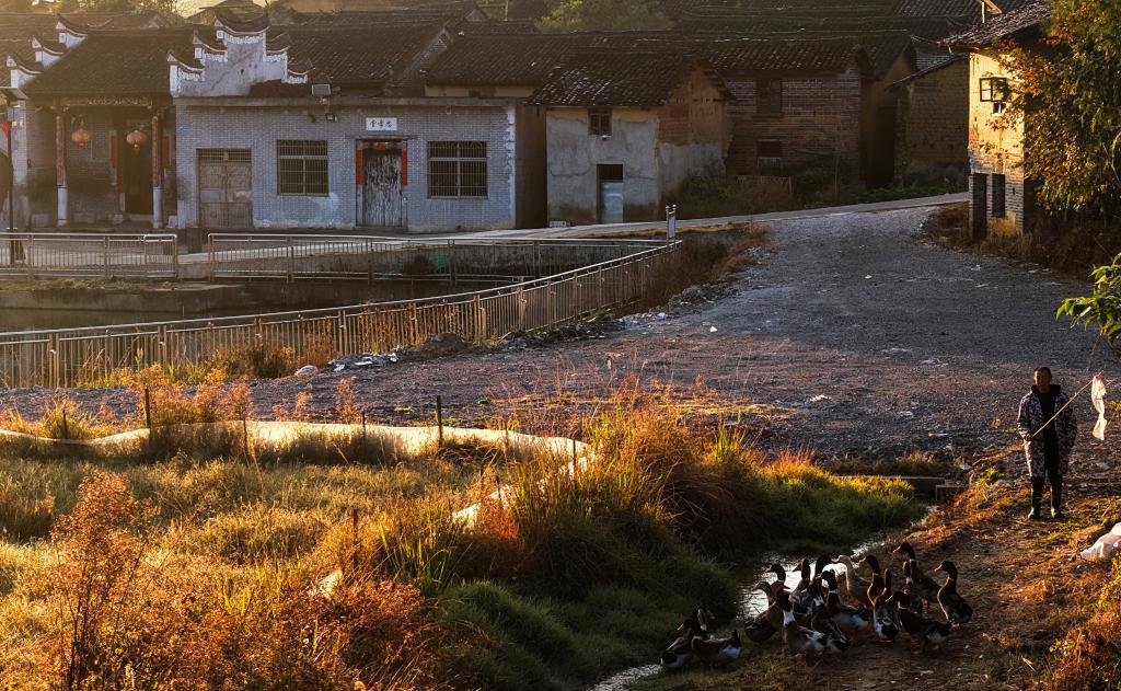 郴州市汝城県金山村で、アヒルを放し飼いにする住民。(11月24日撮影、長沙=新華社記者/劉蓮芬)