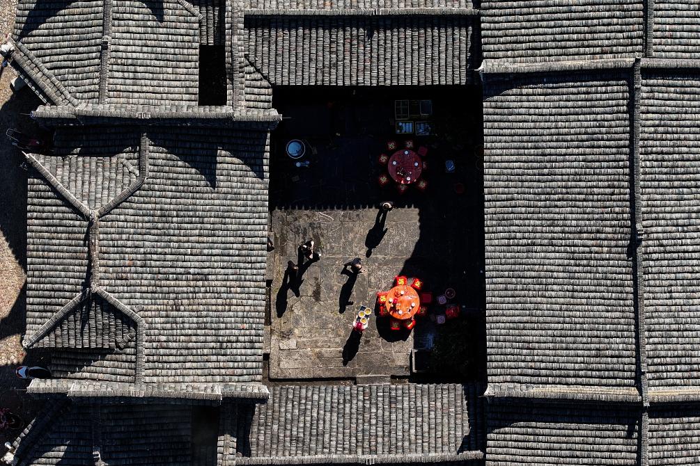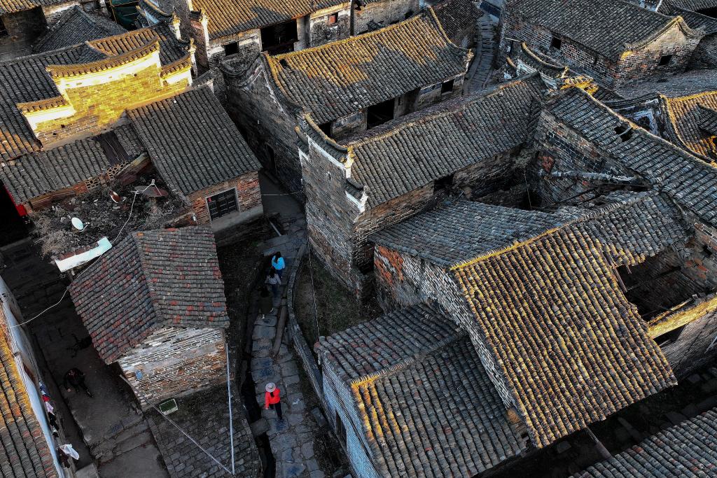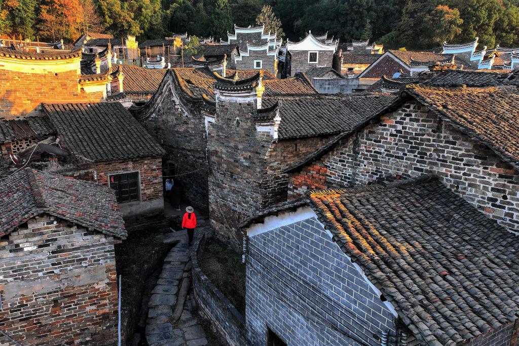 郴州市永興県板梁古村を散策する人。(11月26日、ドローンから、長沙=新華社記者/趙仲志)