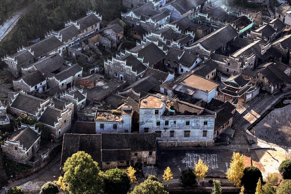 郴州市永興県板梁古村の建物。(11月26日、ドローンから、長沙=新華社記者/趙仲志)