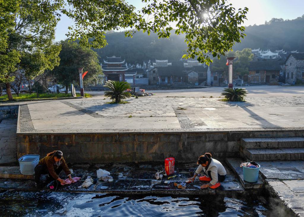 郴州市永興県板梁古村の水辺で洗濯する住民。(11月26日撮影、長沙=新華社記者/趙仲志)