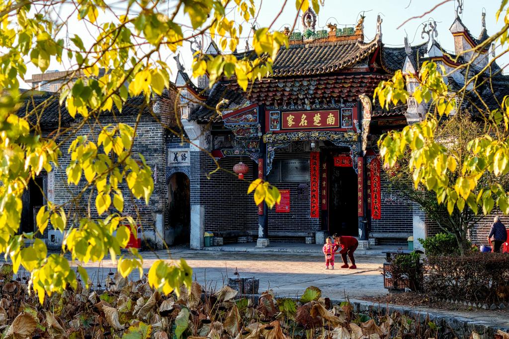 郴州市汝城県金山村にある全國重點文物保護単位「盧氏家廟(敘倫堂)」の前で遊ぶ親子。(11月24日撮影、長沙=新華社記者/劉蓮芬)