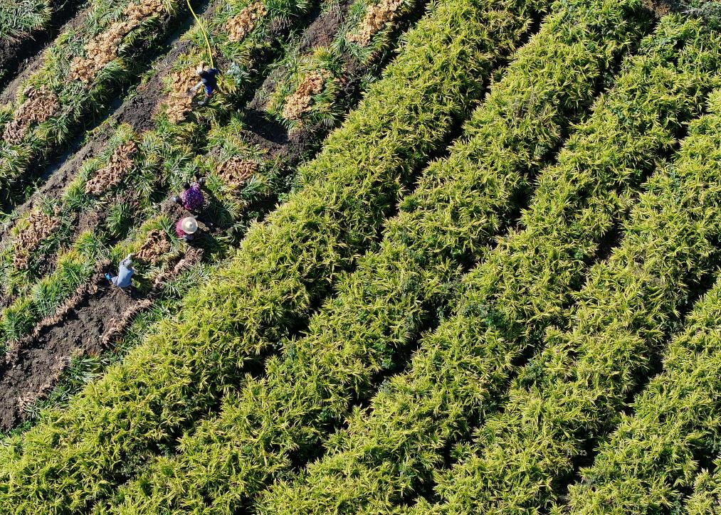 郴州市汝城県金山村の畑で、ショウガの一種「小黃姜(しょうおうきょう)」を収穫する農家の人。(11月24日、ドローンから、長沙=新華社記者/趙仲志)