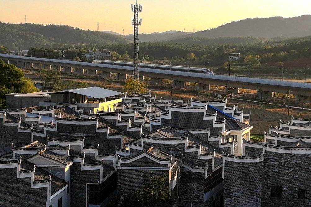 郴州市永興県板梁古村のそばを通過する高速鉄道の列車。(11月25日、ドローンから、長沙=新華社記者/趙仲志)