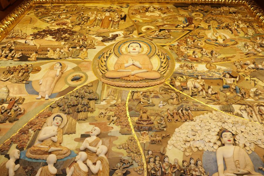 靜安寺・大雄寶殿の釈迦牟尼(しゃかむに)仏像背後に配置された玉彫刻。中央の主仏は釈迦牟尼仏。(11月3日撮影、上海=新華社記者/藍建中)