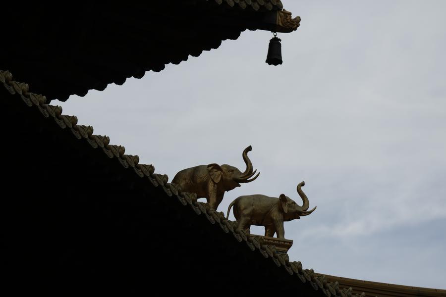 靜安寺・牟尼殿の屋根に施された象の彫刻。(11月3日撮影、上海=新華社記者/藍建中)