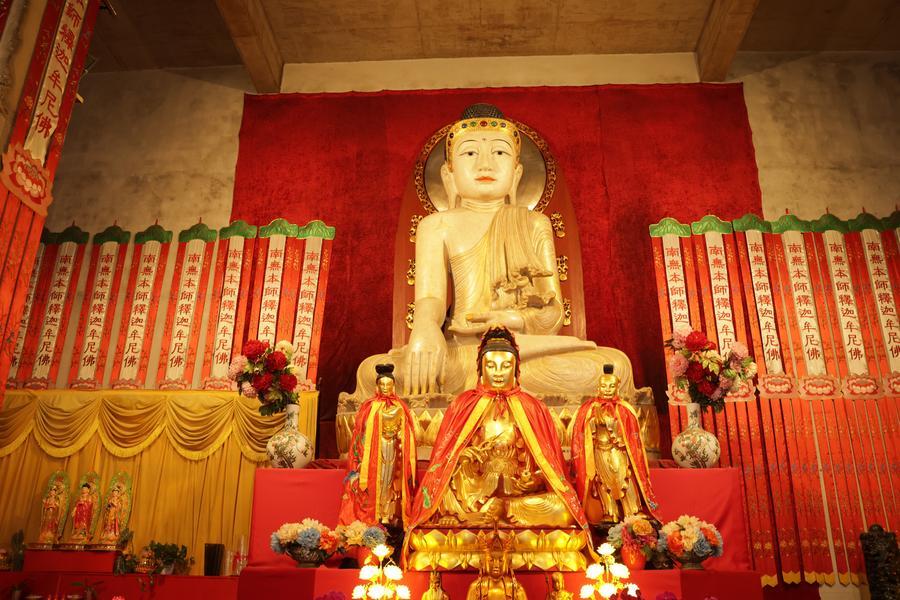 靜安寺・大雄寶殿の釈迦牟尼(しゃかむに)仏像背後に配置された玉彫刻。中央の主仏は薬師仏。(11月3日撮影、上海=新華社記者/藍建中)
