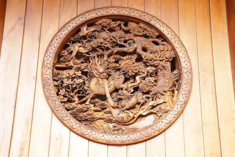 靜安寺・大雄寶殿の正面の壁に施された木彫裝飾。(11月3日撮影、上海=新華社記者/藍建中)