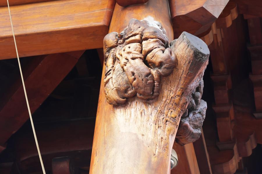 靜安寺・大雄寶殿東南角の柱。木の瘤(こぶ)や枝が殘る。(11月3日撮影、上海=新華社記者/藍建中)