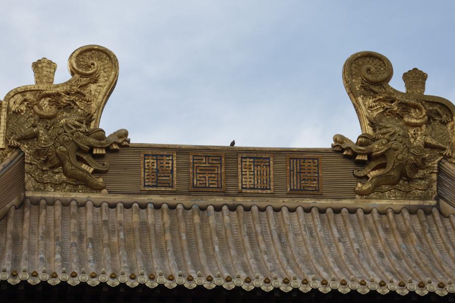 靜安寺・大雄寶殿の屋根の棟に施された「法輪常転」の彫刻。(11月3日撮影、上海=新華社記者/藍建中)