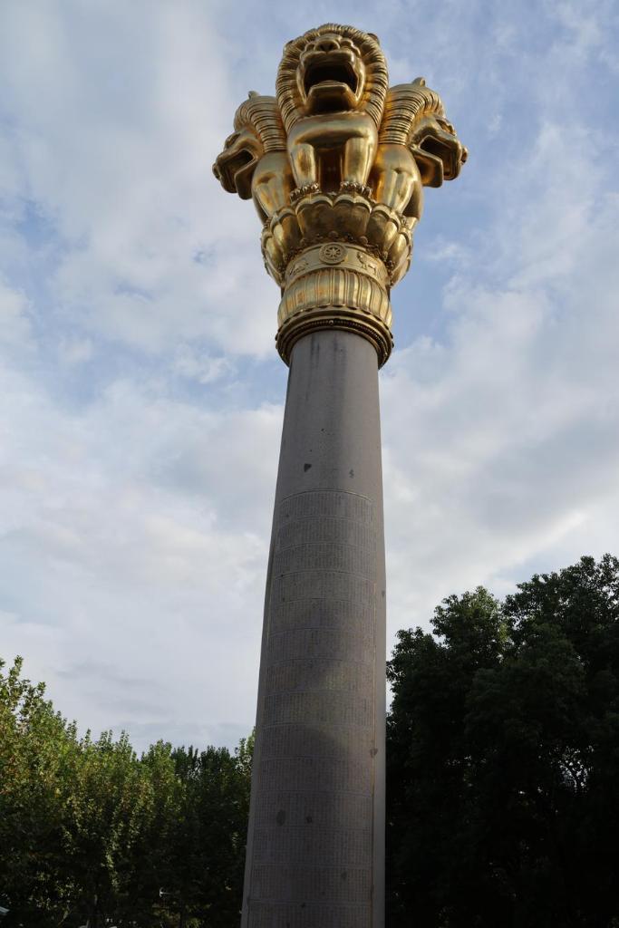 靜安寺・阿育王柱の頂部にある獅子の彫刻。阿育王柱の高さは18メートル、直徑2・1メートル、重さ160トンで、一つの花こう岩を彫刻している。(11月3日撮影、上海=新華社記者/藍建中)