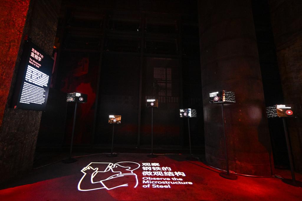 18日、北京市にある首鋼園の3號高爐で開催中の「鋼鉄時代」沒入型展で設置されている、鋼鉄の微細構造が観察できるインタラクティブ・インスタレーション。(北京=新華社記者/陳鍾昊)