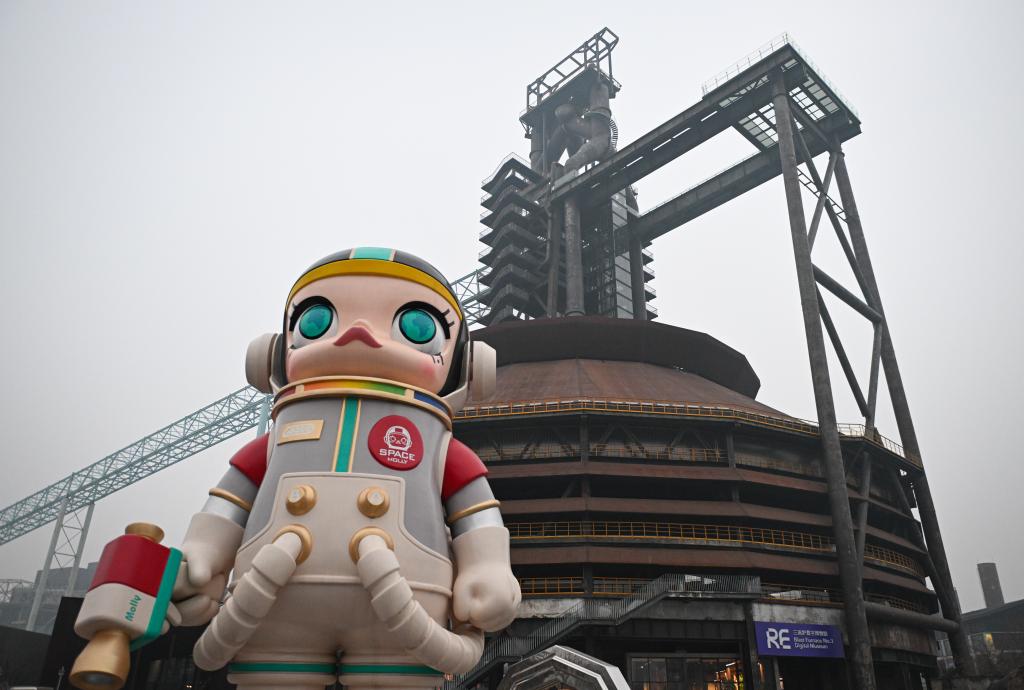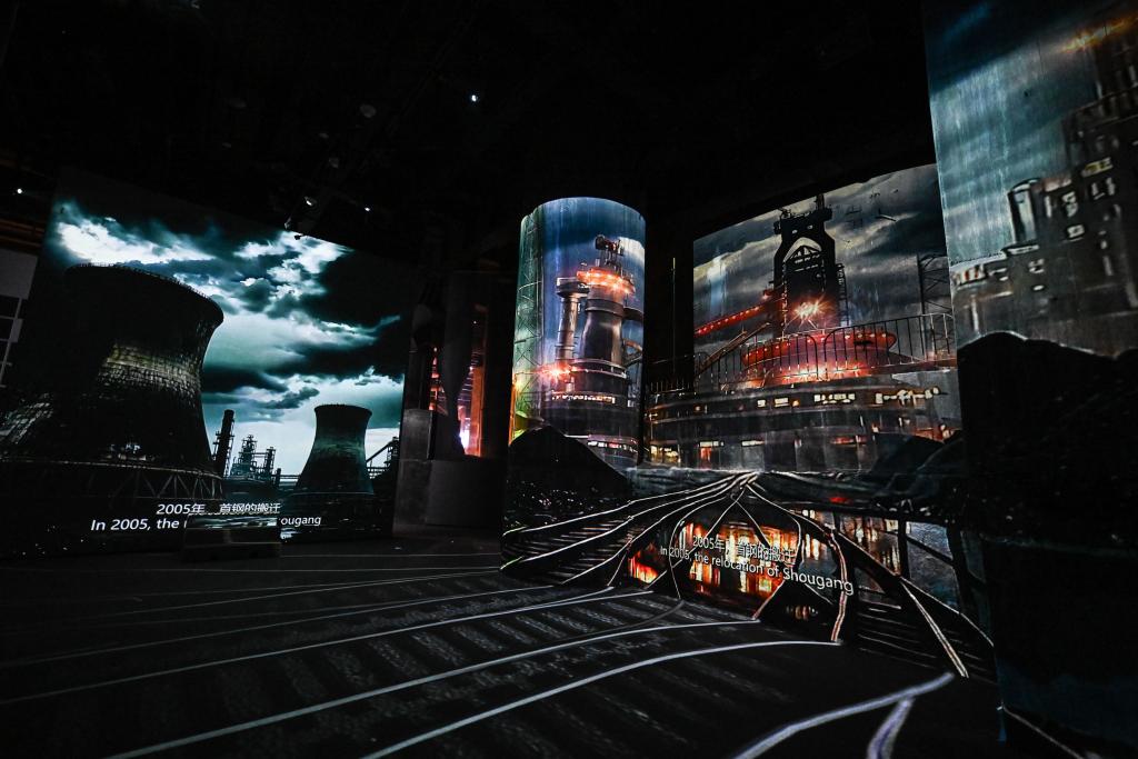 18日、北京市にある首鋼園の3號高爐で開催中の「鋼鉄時代」沒入型展の様子。(北京=新華社記者/陳鍾昊)