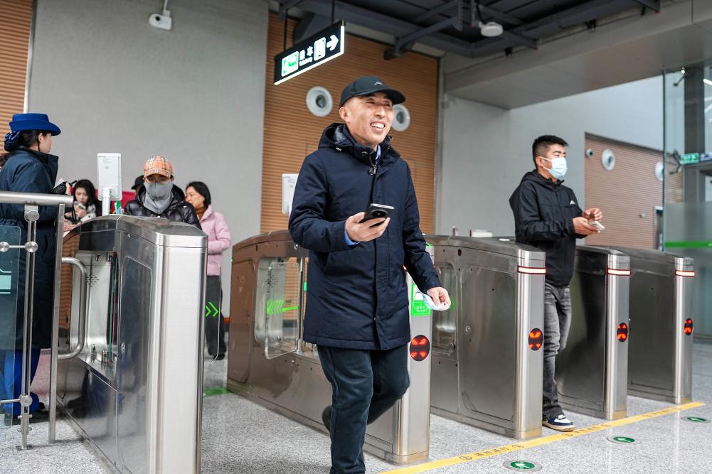 27日、済南軌道交通4號線の泉城公園駅改札を入る市民。(済南=新華社記者/朱崢)