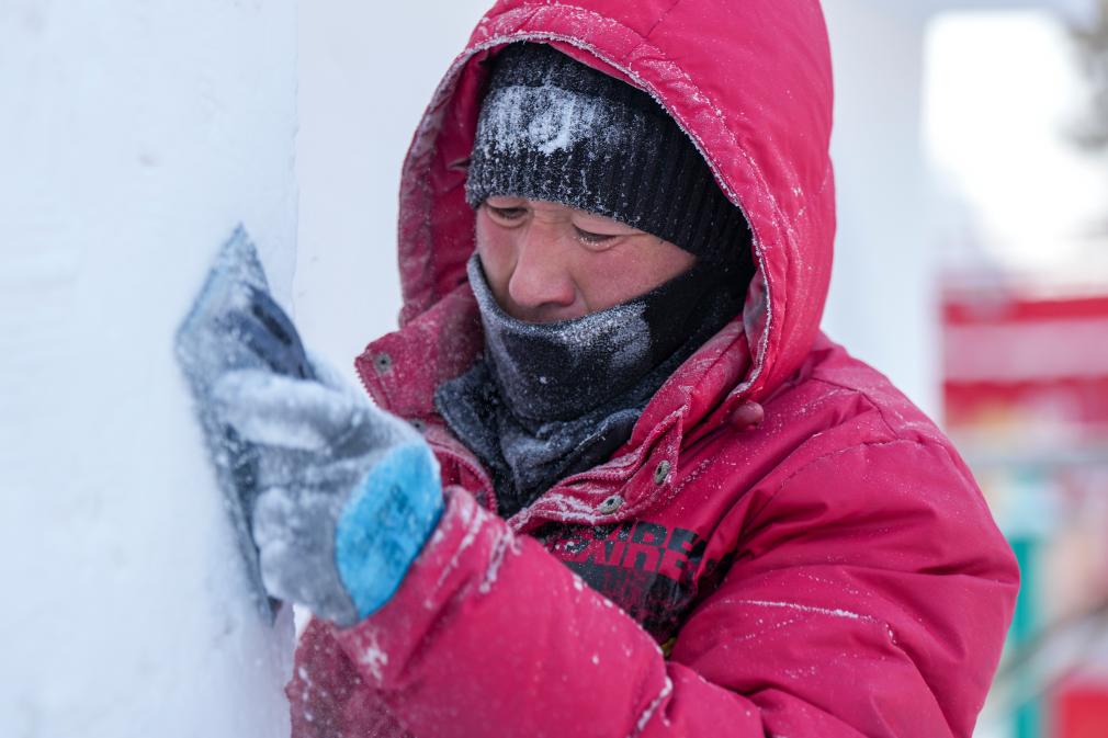 26日、太陽島國際雪像蕓術博覧會の會場で、雪像を製作する人。(ハルビン=新華社記者/王松)