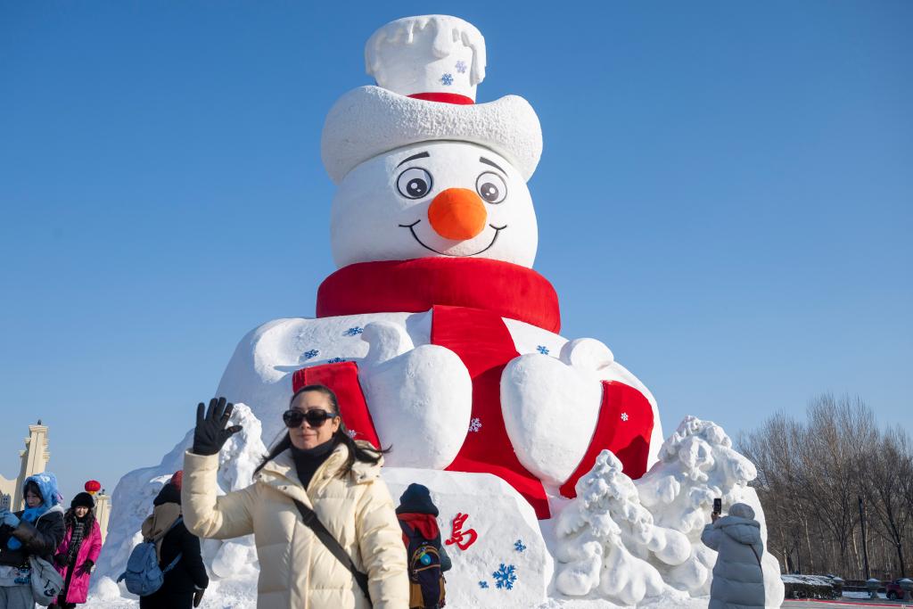 27日、太陽島國際雪像蕓術博覧會で、雪像をバックに記念撮影する人。(ハルビン=新華社記者/張濤)