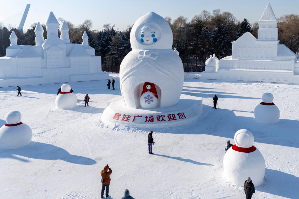 27日、太陽島國際雪像蕓術博覧會を訪れた人たち。(ドローンから、ハルビン=新華社記者/張濤)