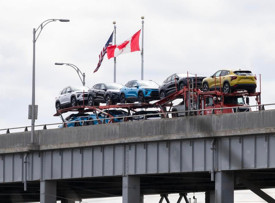 米國とカナダの國境にかかるルイストン・クイーンストン橋を通って米國からカナダに輸送される自動車。カナダ財務省は4月8日、米國の自動車に対する25%の対抗関稅措置を米東部時間同9日午前0時1分に発効すると発表した。(4月9日撮影、ナイアガラフォールズ=新華社記者/鄒崢)