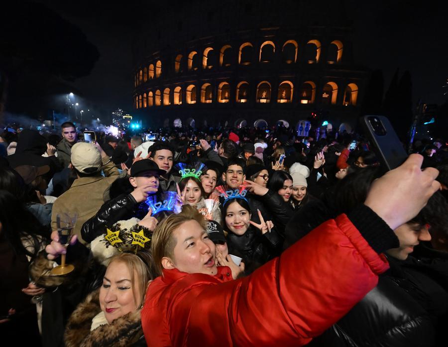 1日、イタリア・ローマのコロッセオで新年を祝う人點。(ローマ=新華社配信)