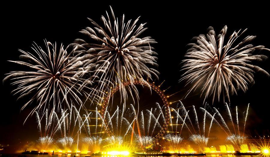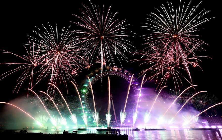 1日、英ロンドンの大型観覧車「ロンドンアイ」で打ち上げられた新年の花火。(ロンドン=新華社記者/李穎)