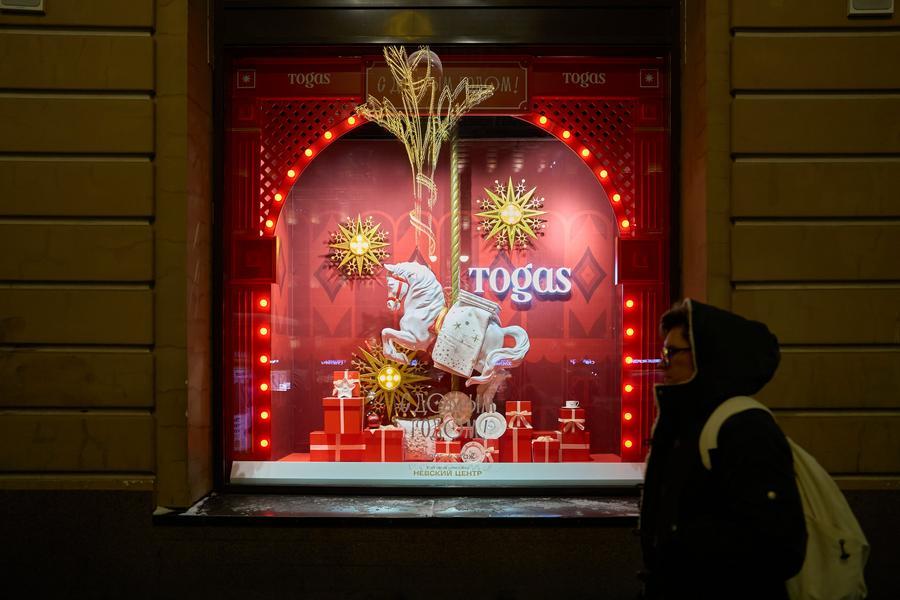 12月31日、ロシア・サンクトペテルブルクで、駿馬が飾られたショーウインドーの前を通り過ぎる人。 (サンクトペテルブルク=新華社配信/郭飛洲)