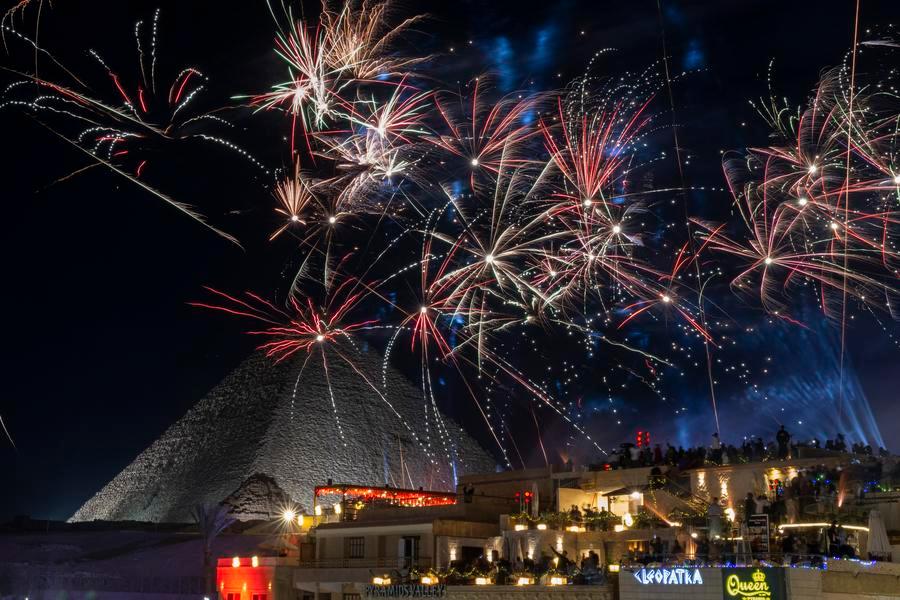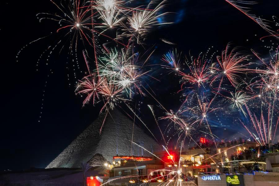 1日、エジプト・ギザのピラミッド群周辺で打ち上げられた新年の花火。(ギザ=新華社記者/辛夢晨)