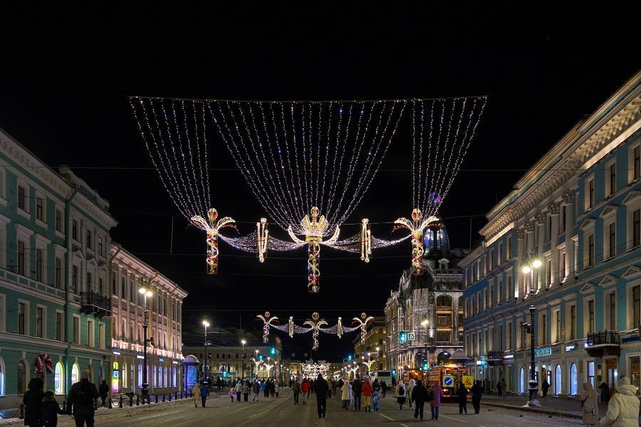 12月31日、ライトアップされたロシア・サンクトペテルブルクのネフスキー大通り。(サンクトペテルブルク=新華社配信/郭飛洲)