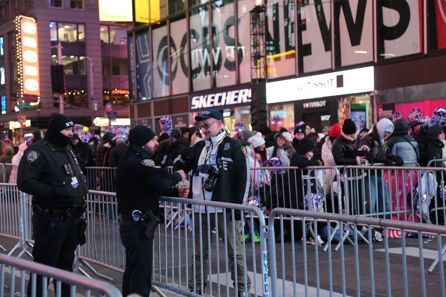 12月31日、米ニューヨークのタイムズスクエアで行われた新年を祝うカウントダウンイベントで警戒に當たる警察官。(ニューヨーク=新華社記者/劉亜南)