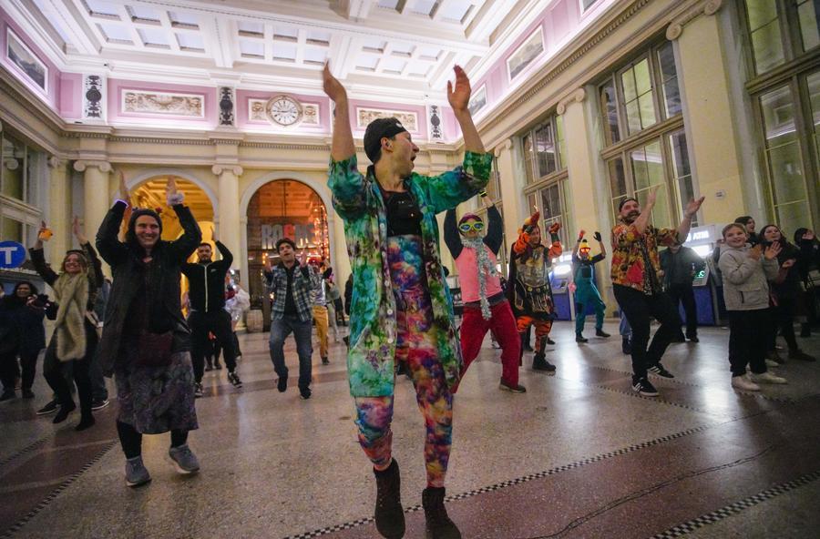 12月31日、カナダ・バンクーバーの地下鉄駅構內で開かれたフラッシュモブのダンスパーティーで、新年を迎える人たち。(バンクーバー=新華社配信/梁森)