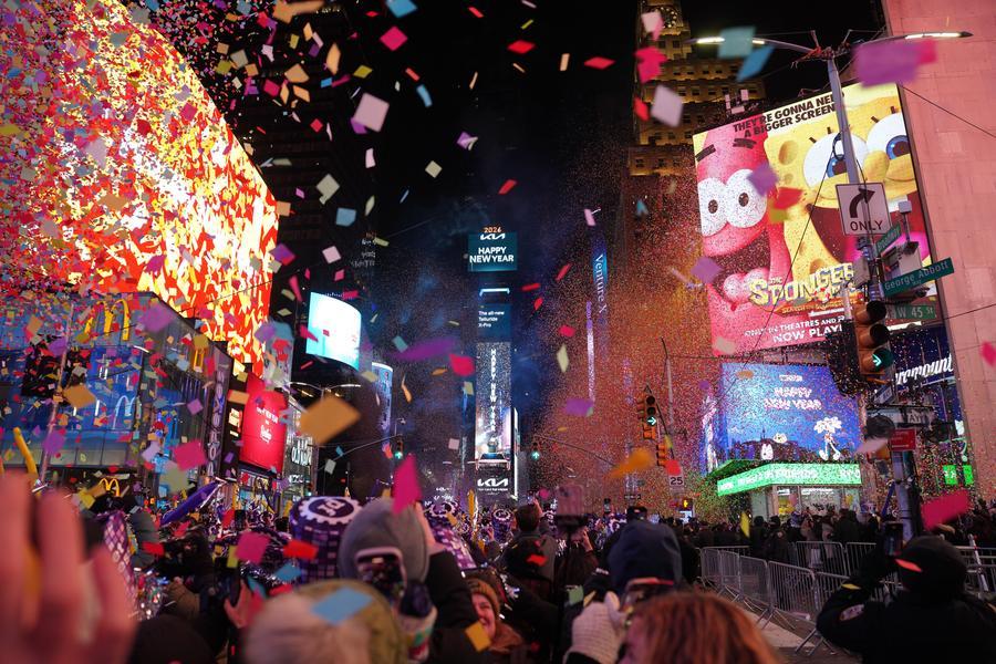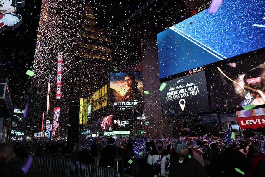 1日、米ニューヨークのタイムズスクエアで、新年を祝うカウントダウンイベントに參加する人點。(ニューヨーク=新華社記者/張鳳國)