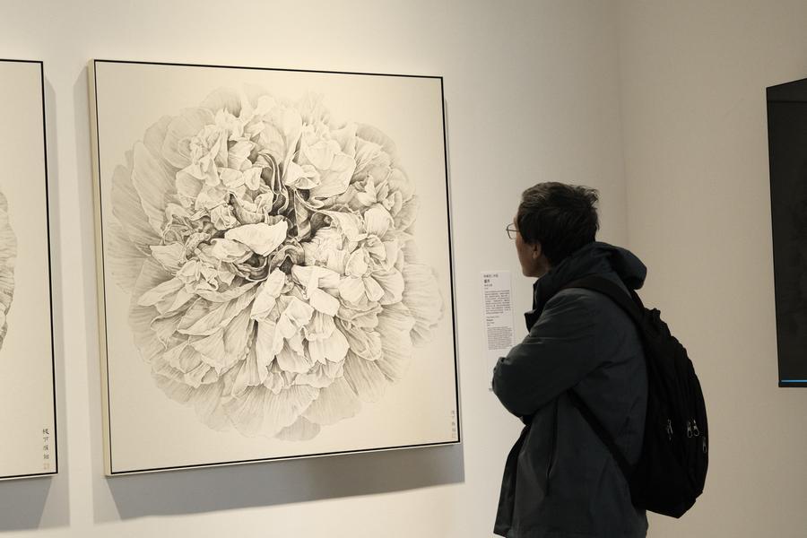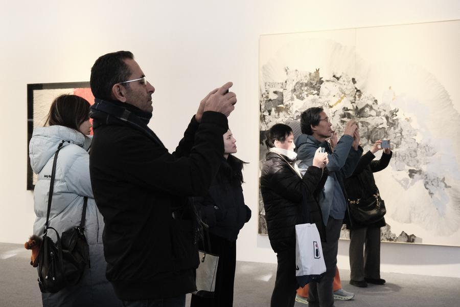 12月30日、北京國際美術ビエンナーレ國際現代水墨蕓術展で作品を鑑賞する來場者。(北京=新華社記者/李卓璠)