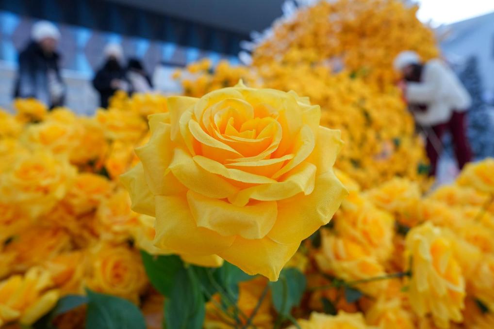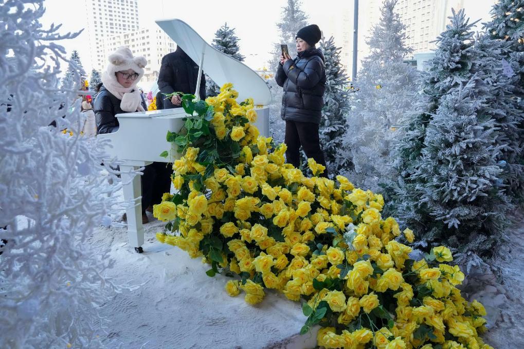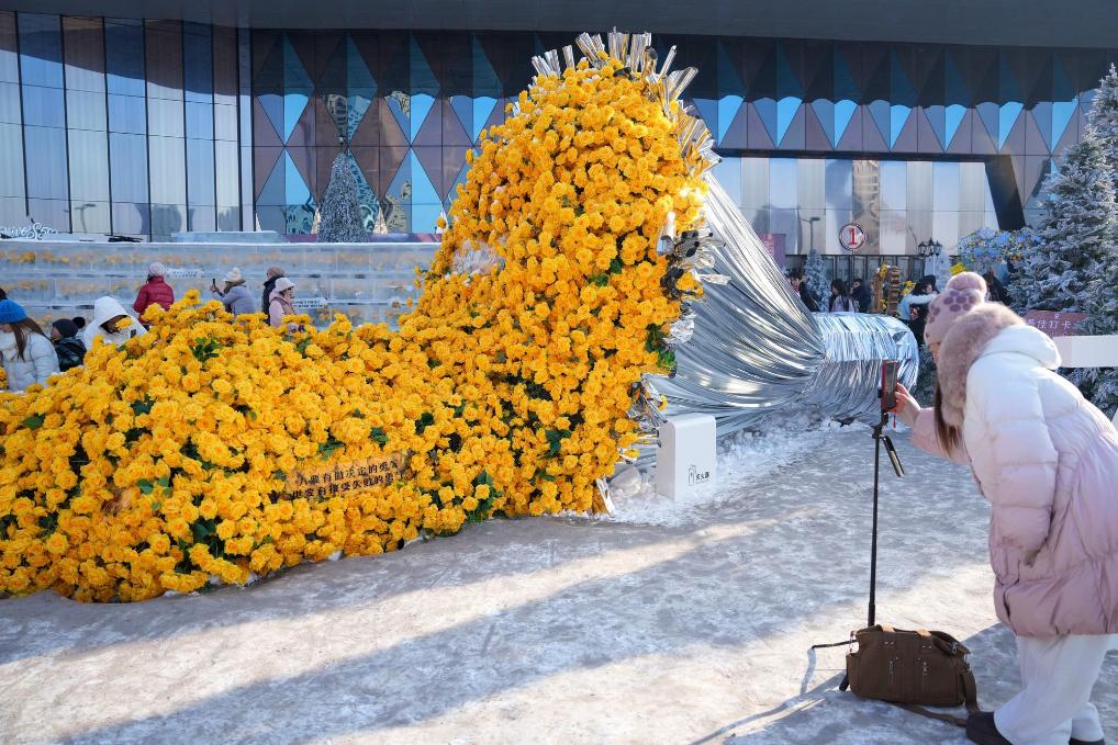 【新華社ハルビン1月5日】中國黒竜江省ハルビン市の商業複合施設、ハルビン西萬達広場前にバラと氷をテーマとしたオブジェが登場し、市民や観光客の目を楽しませている。ロマンチックな雰囲気に引かれて撮影に訪れる人も多い。