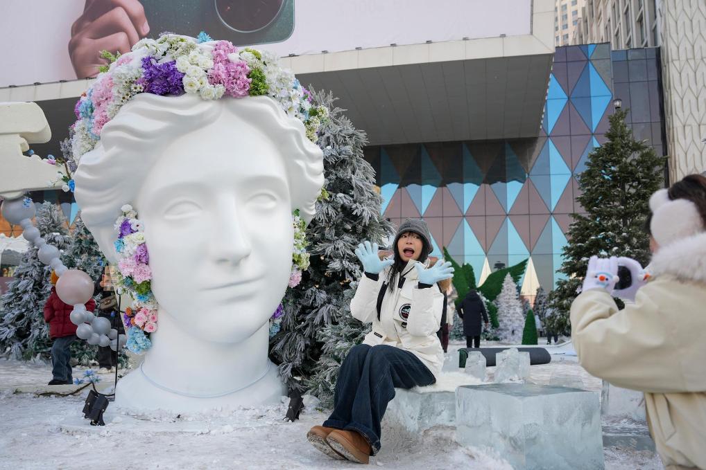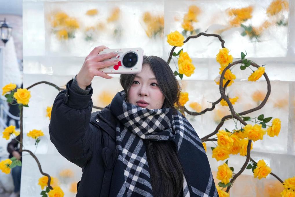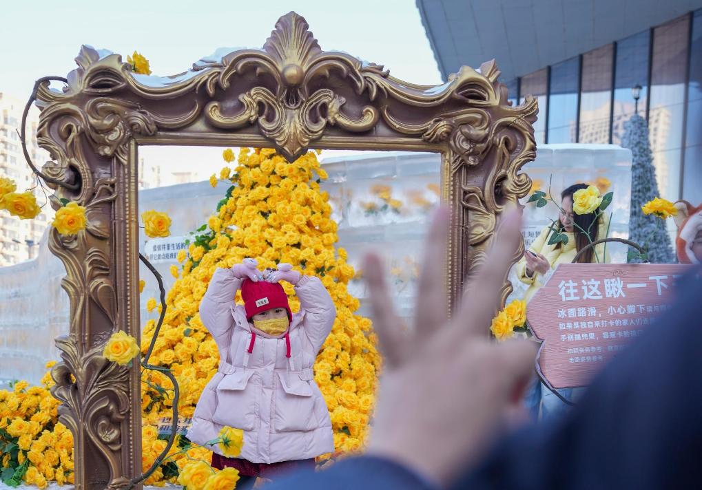 3日、ハルビン西萬達広場前で、バラと氷をテーマとしたオブジェを背景に寫真を撮る観光客。(ハルビン=新華社記者/王建威)