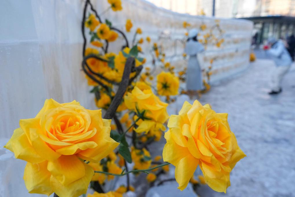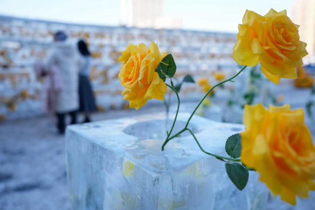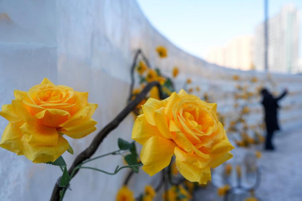 3日、ハルビン西萬達広場前に設置された、バラと氷をテーマとしたオブジェ。(ハルビン=新華社記者/王建威)
