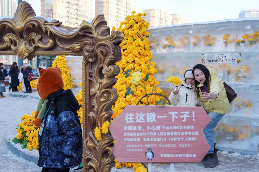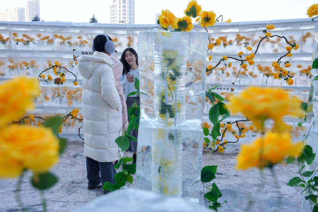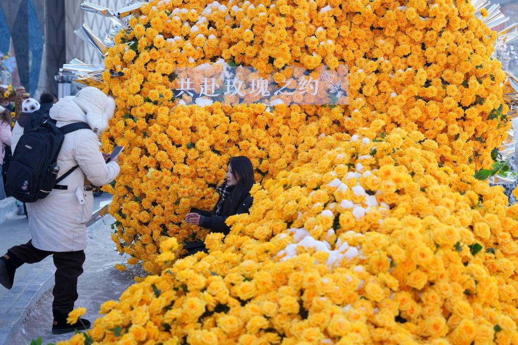 3日、ハルビン西萬達広場前で、バラと氷をテーマとしたオブジェを撮影する観光客。(ハルビン=新華社記者/王建威)