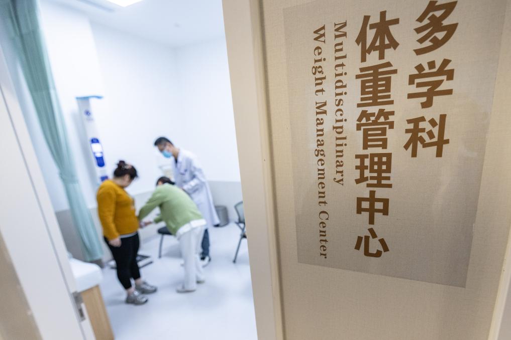 浙江省湖州市中心醫院の「體重外來」。初回受診患者がウエスト、體重、身長などを測定している。(2025年3月20日撮影、湖州=新華社配信/伊凡)
