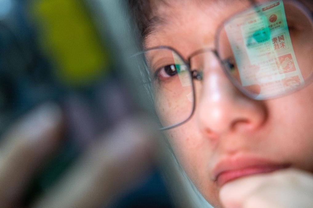 浙江省湖州市でデリバリーアプリを眺めて食欲を紛らわせている減量中の女性。。(2025年5月4日撮影、湖州=新華社配信/伊凡)