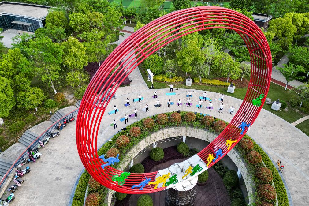 浙江省湖州市南太湖新區の外荘公園で體重管理のためにトレーニングする住民。(2025年4月14日、ドローンから、湖州=新華社配信/伊凡)
