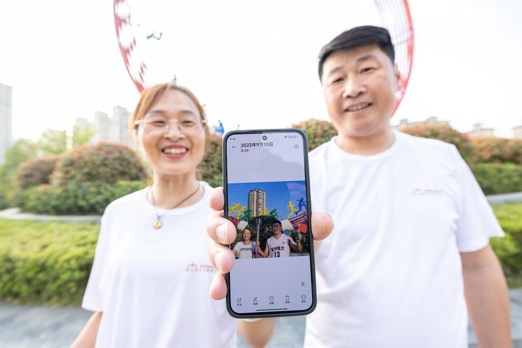 浙江省湖州市南太湖新區の外荘公園で運動を続ける張さん夫妻。それぞれ15キロ以上の減量に成功したという。(2025年4月14日撮影、湖州=新華社配信/伊凡)