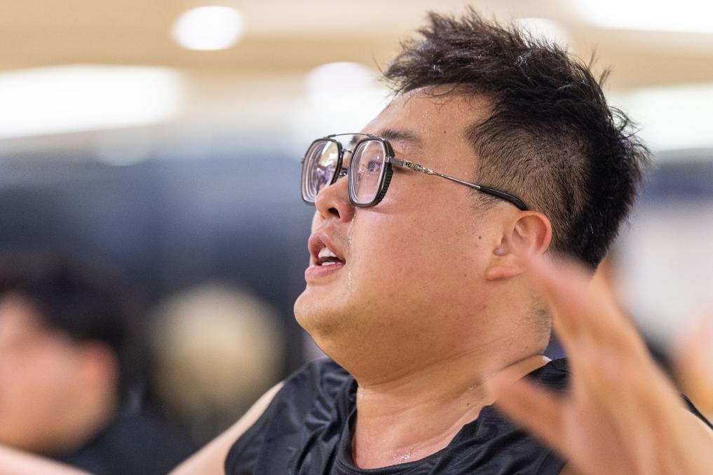 浙江省湖州市長興県で行われた「減量キャンプ」で汗を流す男性。妻とともに杭州から訪れ、それぞれ10キロの減量に成功したという。(2025年3月18日撮影、湖州=新華社配信/伊凡)