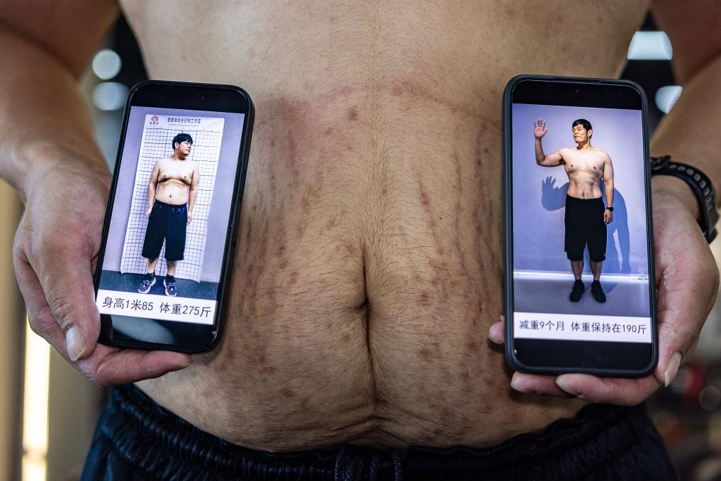 浙江省湖州市愛山街道のトレーニングスタジオで減量成果を披露する住民。(2025年11月5日撮影、湖州=新華社配信/伊凡)
