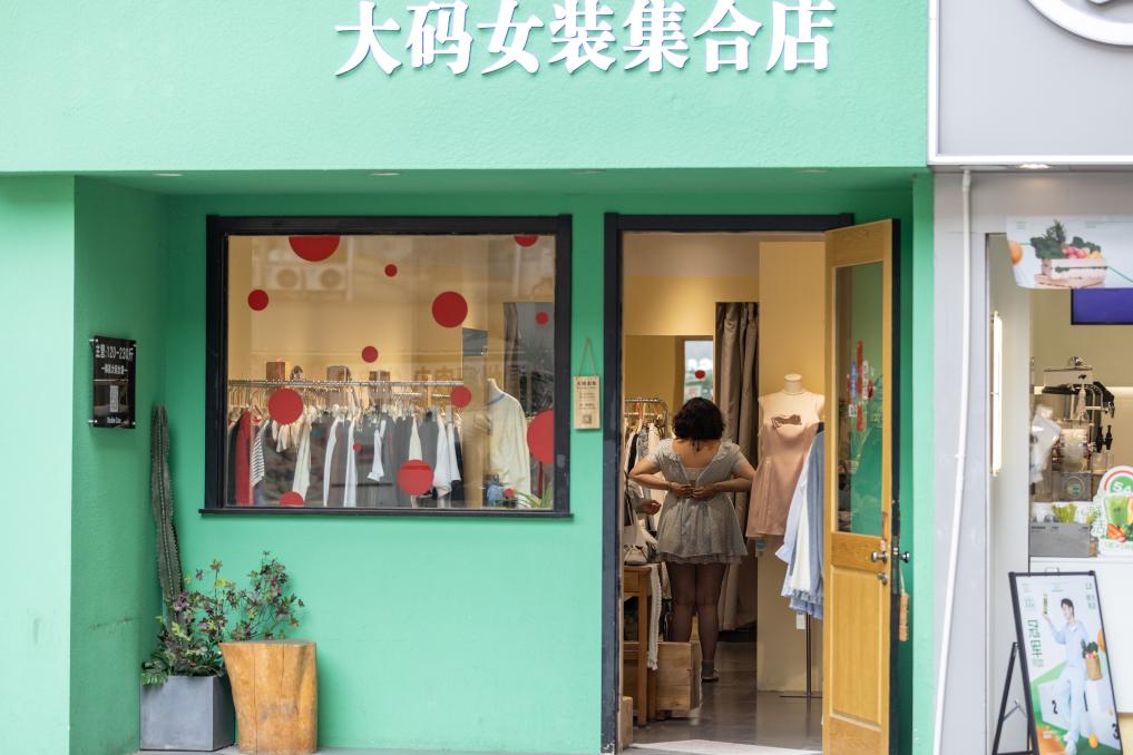 浙江省湖州市呉興區にある大きいサイズの婦人服店。(2025年4月1日撮影、湖州=新華社配信/伊凡)