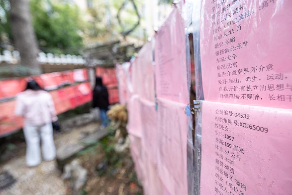 浙江省湖州市の「相親角(お見合いコーナー)」に掲示された婚活情報。相手の體重に関する要望を明記したものもある。(2025年3月28日撮影、湖州=新華社配信/伊凡)