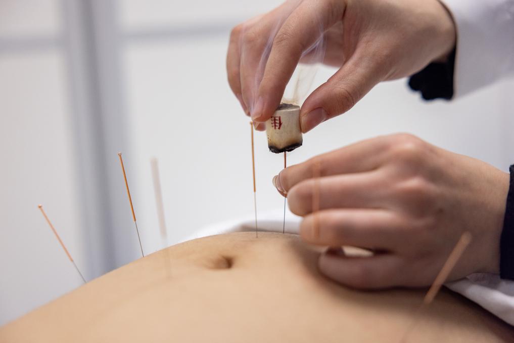 浙江省湖州市呉興區中醫院で行われているはりによる減量治療。(2025年3月21日撮影、湖州=新華社配信/伊凡)