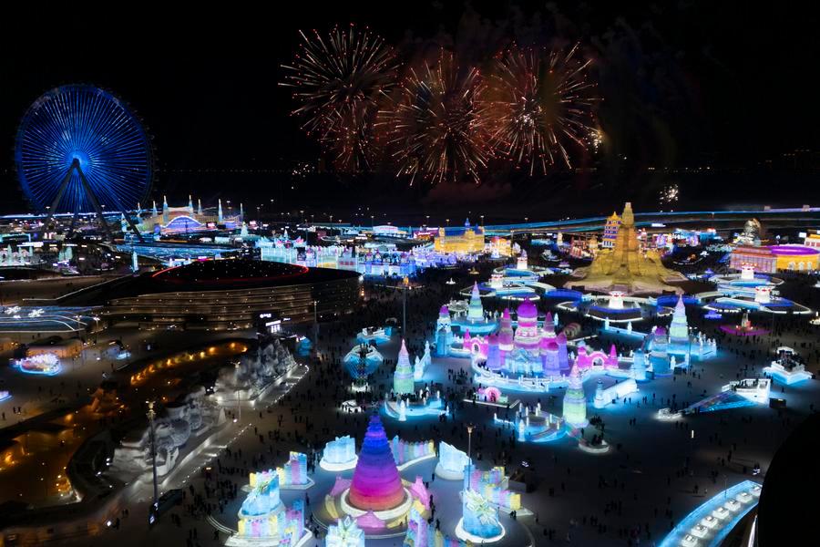 5日、ハルビン氷雪大世界で打ち上げられた花火。(ドローンから、ハルビン=新華社記者/王松)