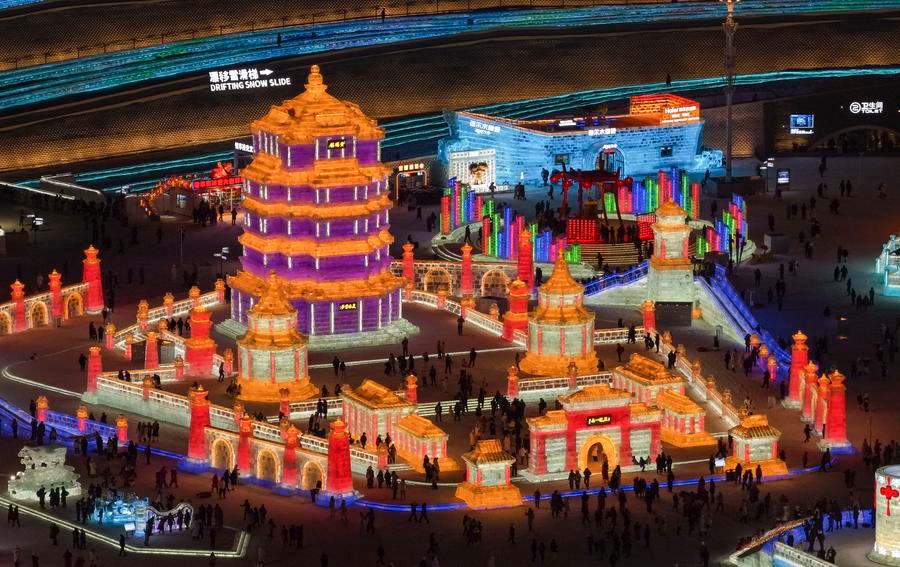 5日、ハルビン氷雪大世界。(ドローンから、ハルビン=新華社記者/張濤)
